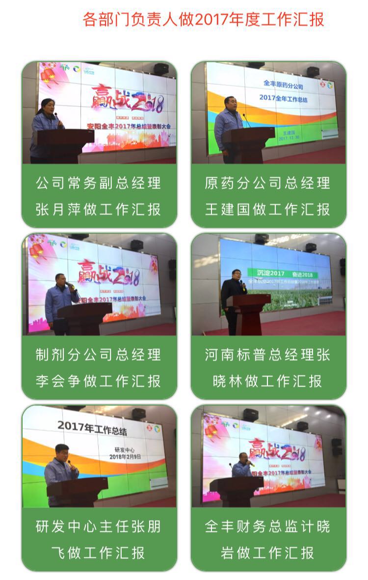 會(huì)上各部門(mén)負(fù)責(zé)人就2017年工作進(jìn)行了認(rèn)真總結(jié),并提出2018年工作規(guī)劃和目標(biāo),公司董事長(zhǎng)、總經(jīng)理王志國(guó)做了公司2017年工作報(bào)告。王總講到,過(guò)去的2017年在所有全豐人的共同努力下,公司取得了一定的工作業(yè)績(jī),成立了院士工作站,被國(guó)家農(nóng)業(yè)部確定為國(guó)內(nèi)一家航空植保重 點(diǎn)實(shí)驗(yàn)室,并獲得全國(guó)五一勞動(dòng)獎(jiǎng)狀。安陽(yáng)全豐已初步完成農(nóng)業(yè)產(chǎn)業(yè)化布局。依托現(xiàn)有原藥和制劑業(yè)務(wù)板塊,全豐航空和標(biāo)普農(nóng)業(yè)立足智慧農(nóng)業(yè)五大模塊持續(xù)發(fā)力,力爭(zhēng)做國(guó)內(nèi)行業(yè)智慧農(nóng)業(yè)服務(wù)商,并談到全豐未來(lái)三至五年的發(fā)展規(guī)劃。