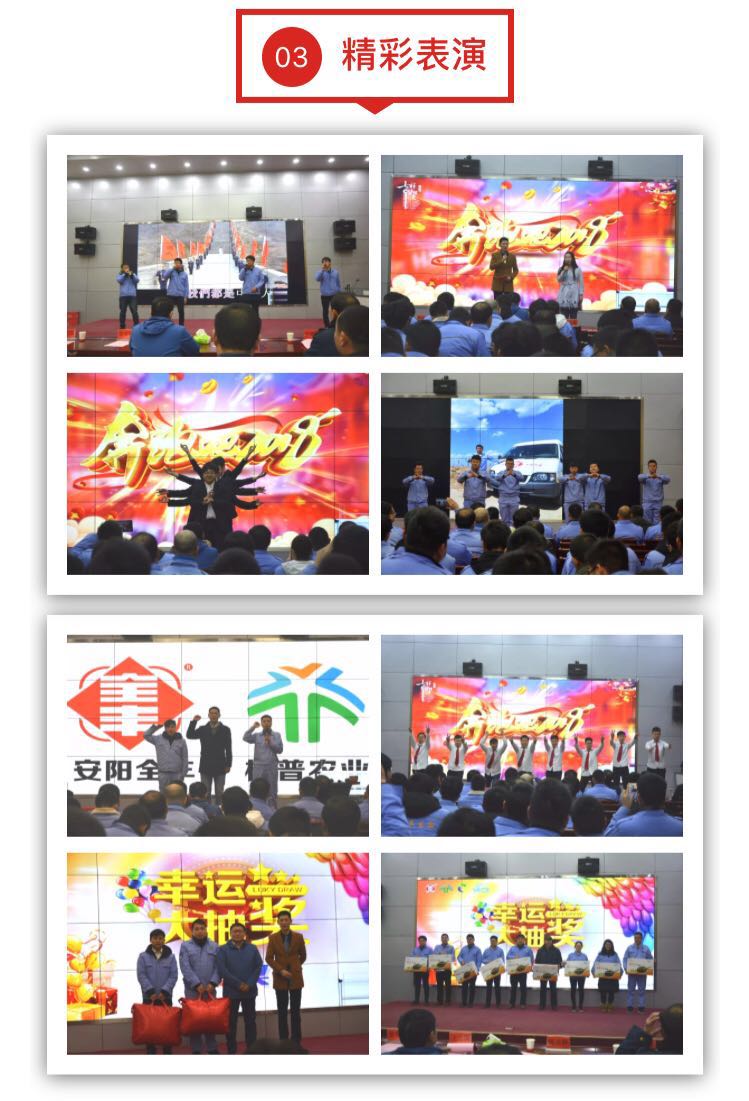 隆重的總結(jié)表彰活動(dòng)結(jié)束后,以“奔跑吧2018”為主題的聯(lián)歡會(huì)拉開(kāi)序幕。原藥分公司的一曲《我是中國(guó)人》唱出了全豐人的豪邁,太行培訓(xùn)學(xué)校表演的舞蹈《舞動(dòng)青春》和制劑分公司表演的《新春舞會(huì)》有異曲同工之妙,博得現(xiàn)場(chǎng)陣陣掌聲,標(biāo)普公司表演的小品《我是飛行員》把一個(gè)失戀青年加入飛防隊(duì)伍后的徹底蛻變刻畫(huà)得惟妙惟肖。飛防隊(duì)的小伙子們也帶來(lái)驚喜,太極拳表演柔中帶剛、虎虎生威,生產(chǎn)技術(shù)部的男女聲獨(dú)唱和財(cái)務(wù)部的二胡表演各具特色,活動(dòng)現(xiàn)場(chǎng)的幸運(yùn)抽獎(jiǎng)環(huán)節(jié)更是讓現(xiàn)場(chǎng)歡呼聲和掌聲此起彼伏。歡笑聲中,全豐人告別了2017年,2018年我們攜手并進(jìn),再創(chuàng)輝煌!全豐人贏戰(zhàn)2018!加油干!